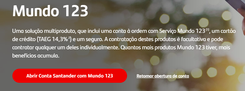 Para iniciar a abertura, basta acessar a página da conta e, após conferir todas as informações, clique em “Abrir conta Santander com Mundo 123”.
