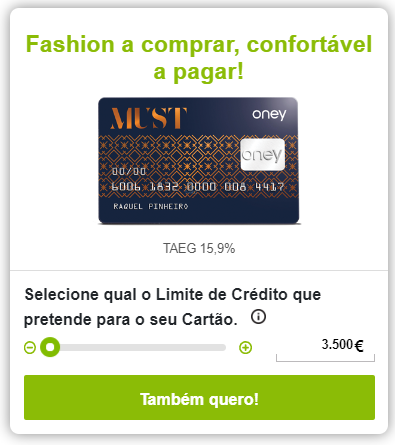 O cartão Must atua como um cartão pré-pago e um cartão de crédito. Além disso, você pode usá-lo para suas compras nas lojas participantes no Freeport Lisboa Fashion Outlet, Vila do Conde Porto Fashion Outlet, e também nas lojas Norauto.
