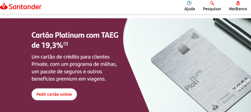 O cartão Santander Platinum é exclusivo para clientes do Santander Private. Com este cartão, você pode ter um limite que varia de 7.000€ até 50.000€, além de uma série de seguros gratuitos, que cobrem acidentes em viagens, atrasos de voo, assistência técnica em casa e muito mais.